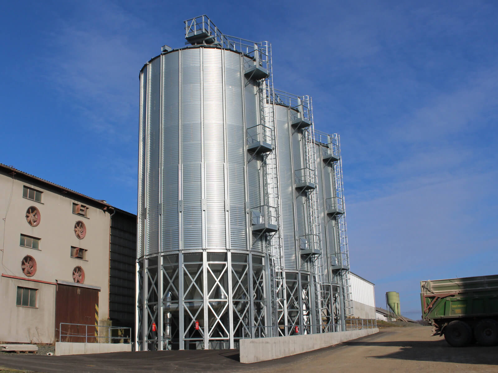 4 sila s rovným dnem Ø 12,74 m, výška 23,06 m, celková kapacita 8 400 t. Napojení na stávající posklizňovou linku, dopravníky o výkonu 80 t/hod.